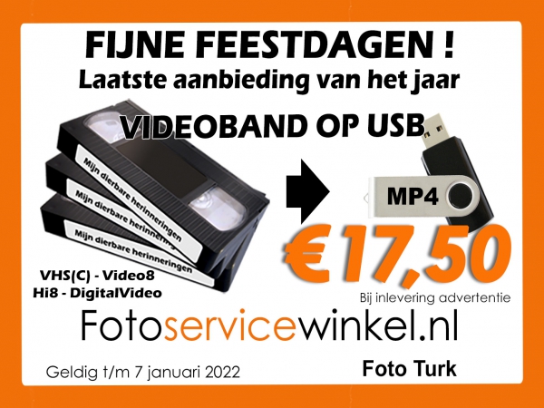 Hoeveel herinneringen heeft u nog op videobanden staan die u graag nog eens terug zou willen zien? Wij kunnen voor u deze videobanden digitaliseren in de hoogst mogelijke kwaliteit op USB-stick zetten. Tot 7 januari voor de actieprijs van € 17.50 per stuk.